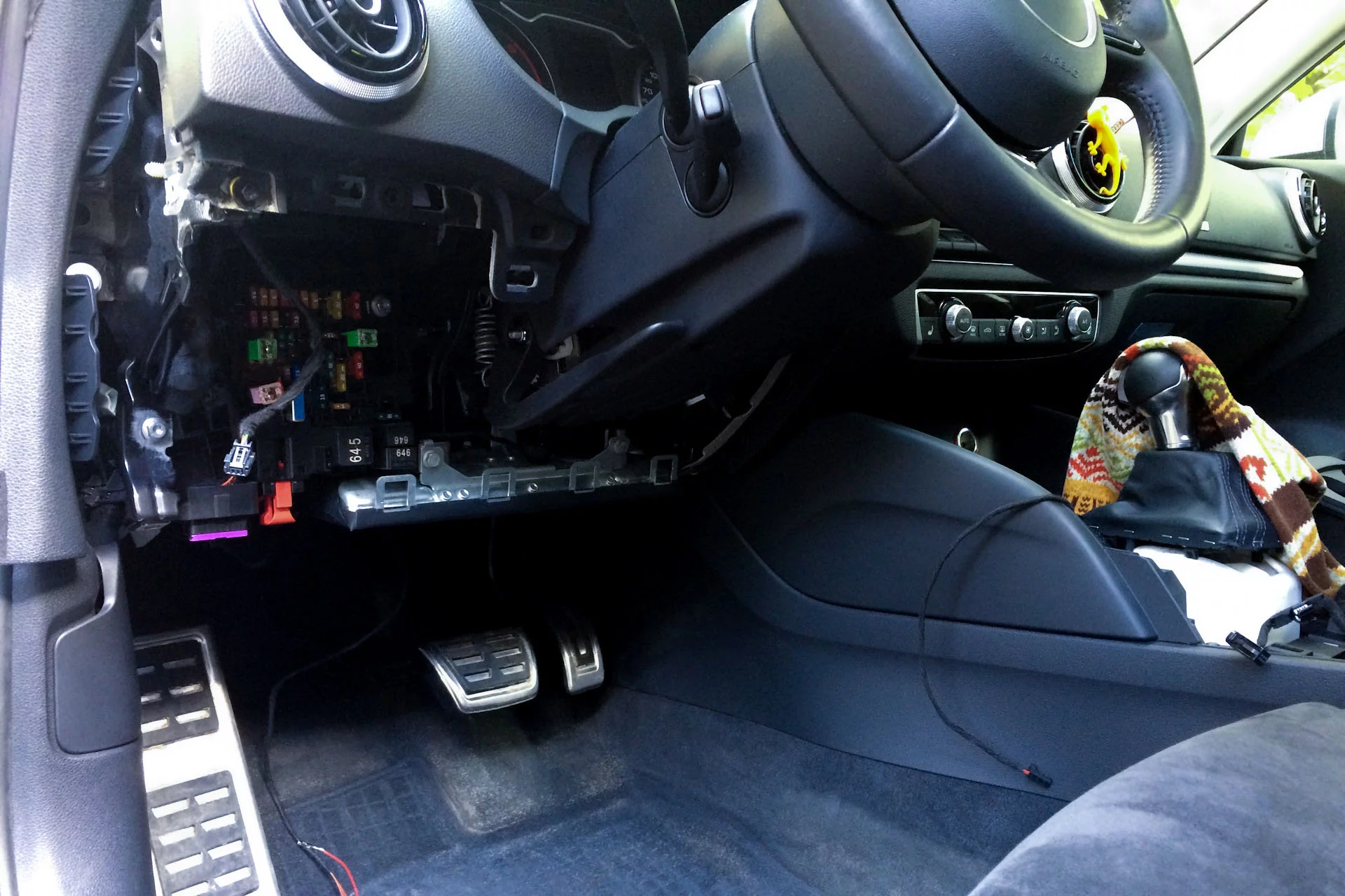 To access the BCM, you need to remove the hood lever and the plastic panel under the steering wheel: