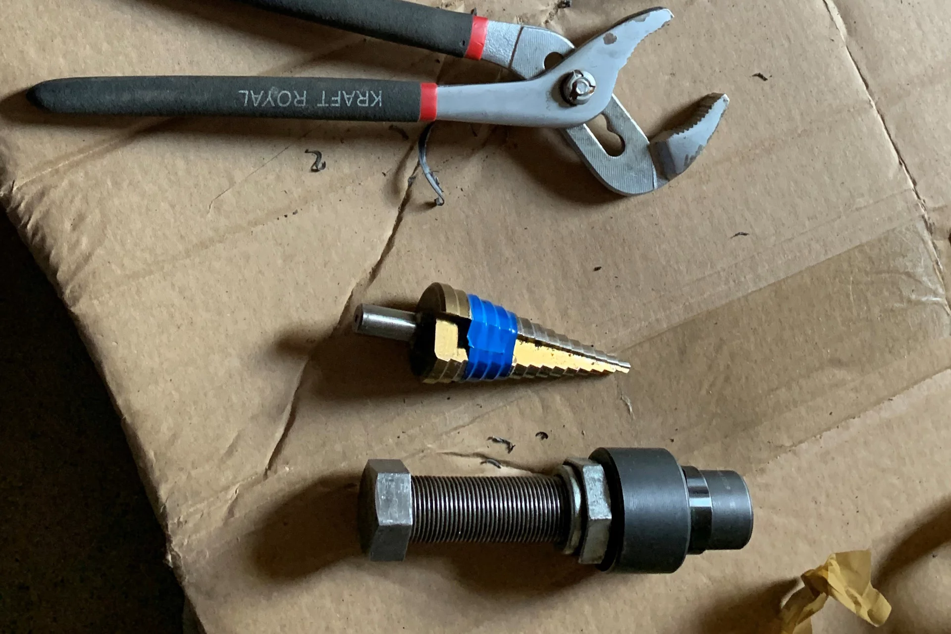 I used this tutorial (many thanks to gamester1), and ordered 27.5mm hole cutter. Surprisingly, it came with a large internal thread – I had to find an additional MEGA-bolt and to use a 20mm pine-cone drill bit first.