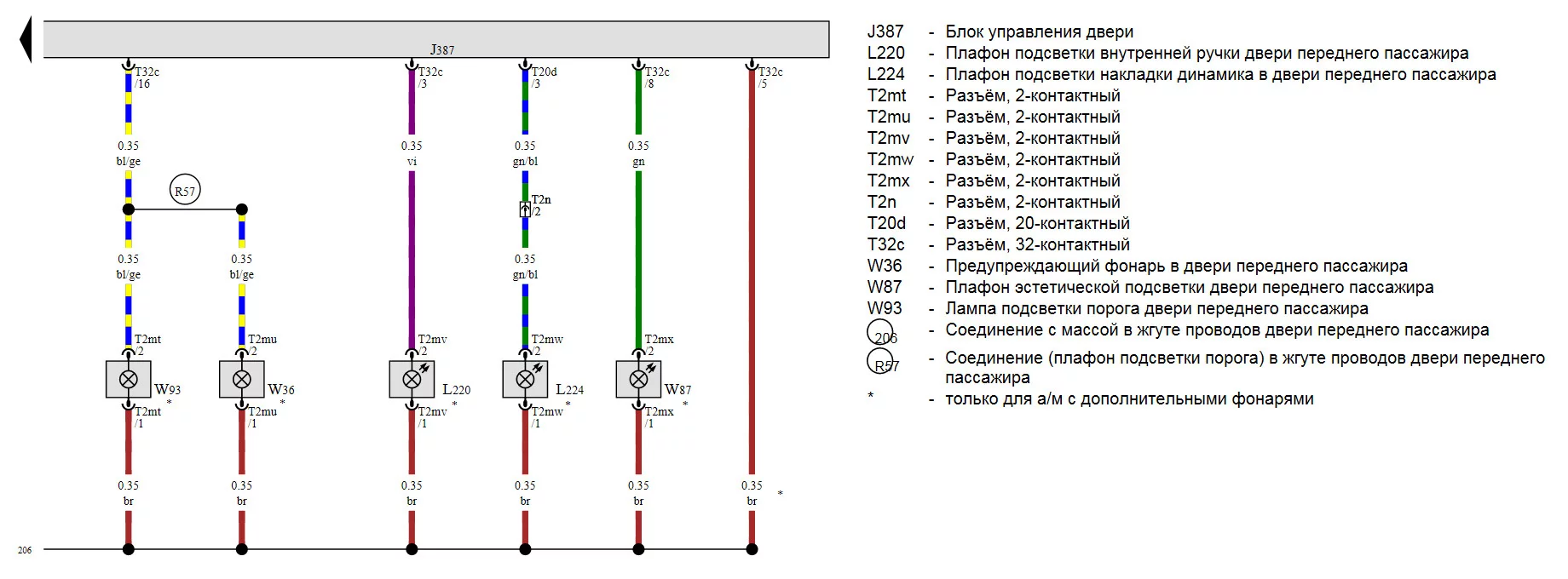 Door handle light (L220 on diagram) ― 3rd pin of T32 connector