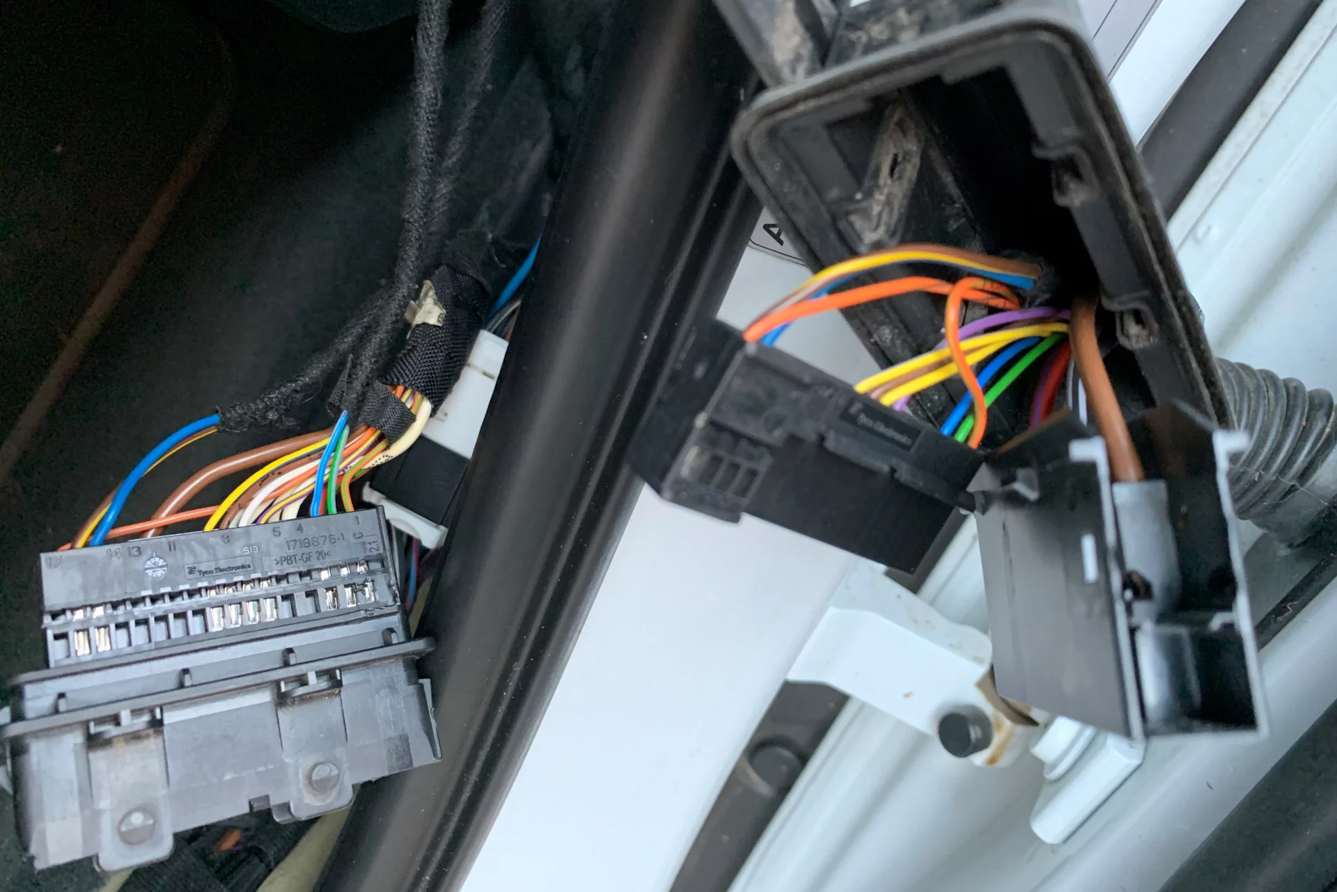 Unlike the left side, pre-facelifted cars have no wiring and no connector to plug in an electrochromic mirror on the right side. The unexpected problem becomes to find a small 2-pin connector with a seal. It is the JAE MX19002S51 and does not have an official VAG part number. My friend Michael M18 gifted me one. You may also refer to his post about a similar retrofit.