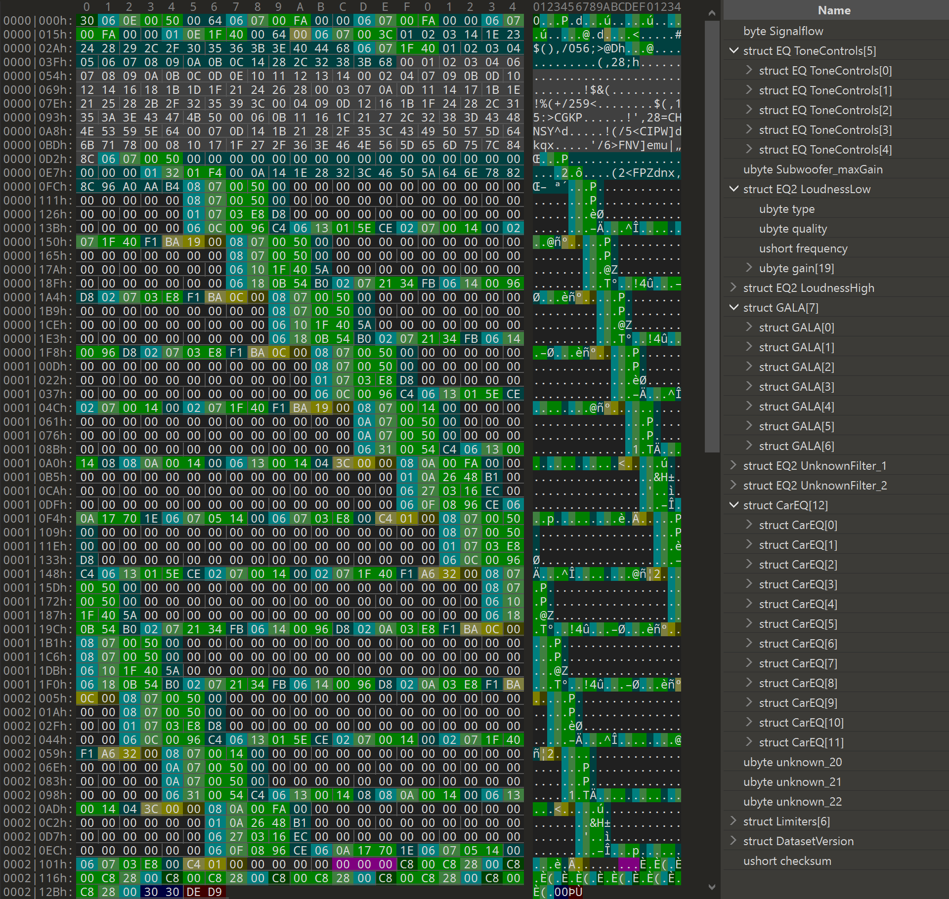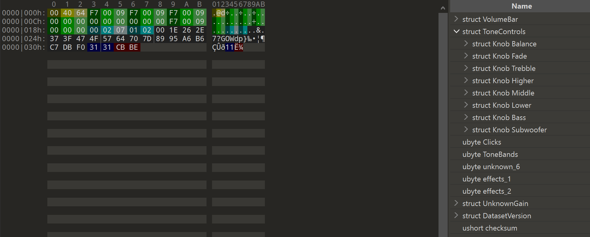 Then there are groups of 3 bytes, with the number of steps to each direction for balance/fade and equalizer bands (few cars have ±6 values, but mostly it is ±9). Next, several flags to enable/disable menu items, the number of visible equalizer bands and names of two sound focusing effects.