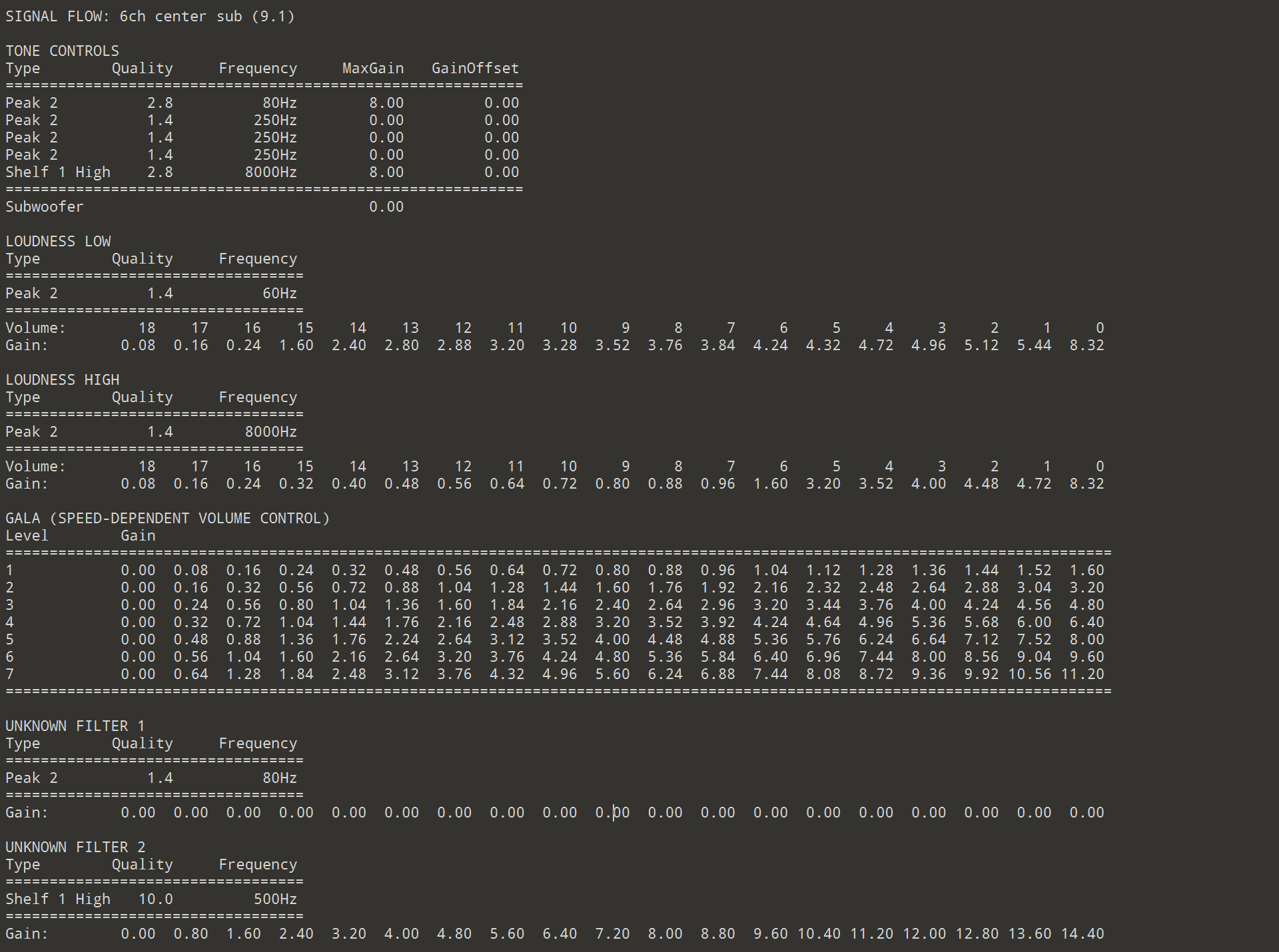 Each channel has its own volume level, delay, phase, and 7 filters to correct the frequency response of a speaker: the first 3 filters have 16-byte tails, but I did not find a single one that uses them.