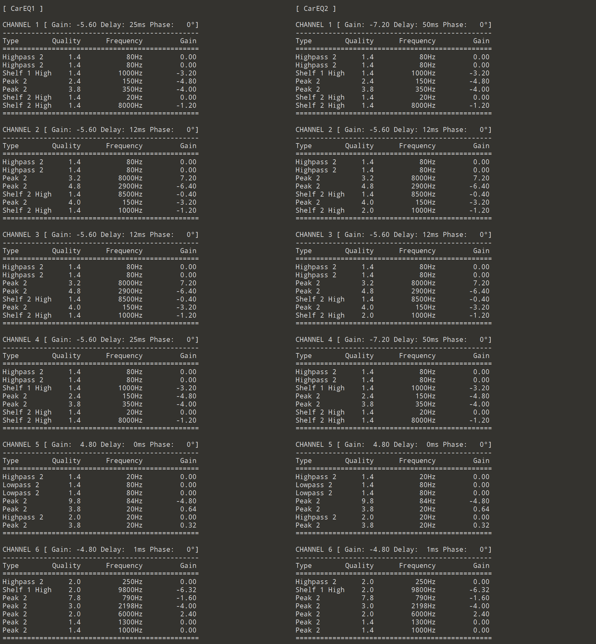 I personally don’t believe that changing frequency curves and delays without special measuring equipment can improve sound quality, nor uploading datasets of cars with 1.5 times larger or smaller saloons than yours.