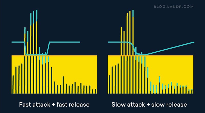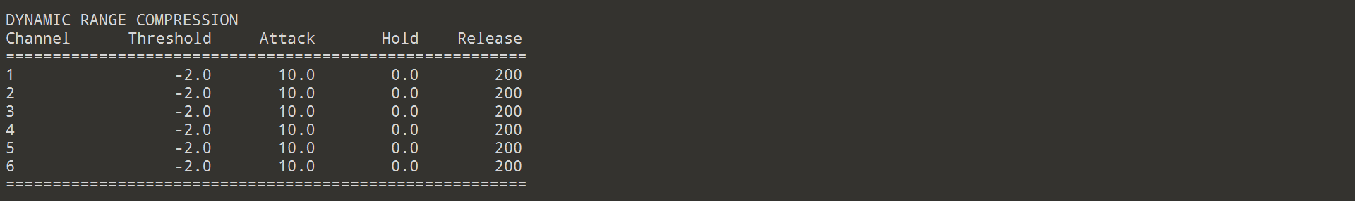 DRC lowers the signal after reaching the Threshold value of -2dB (lower the value – earlier the point to cut it; maximum value with no DRC effect is 0) during the Attack time (10ms), and keeps on this level for the Hold time (0ms), then returns back to initial signal during the Release time (200ms).