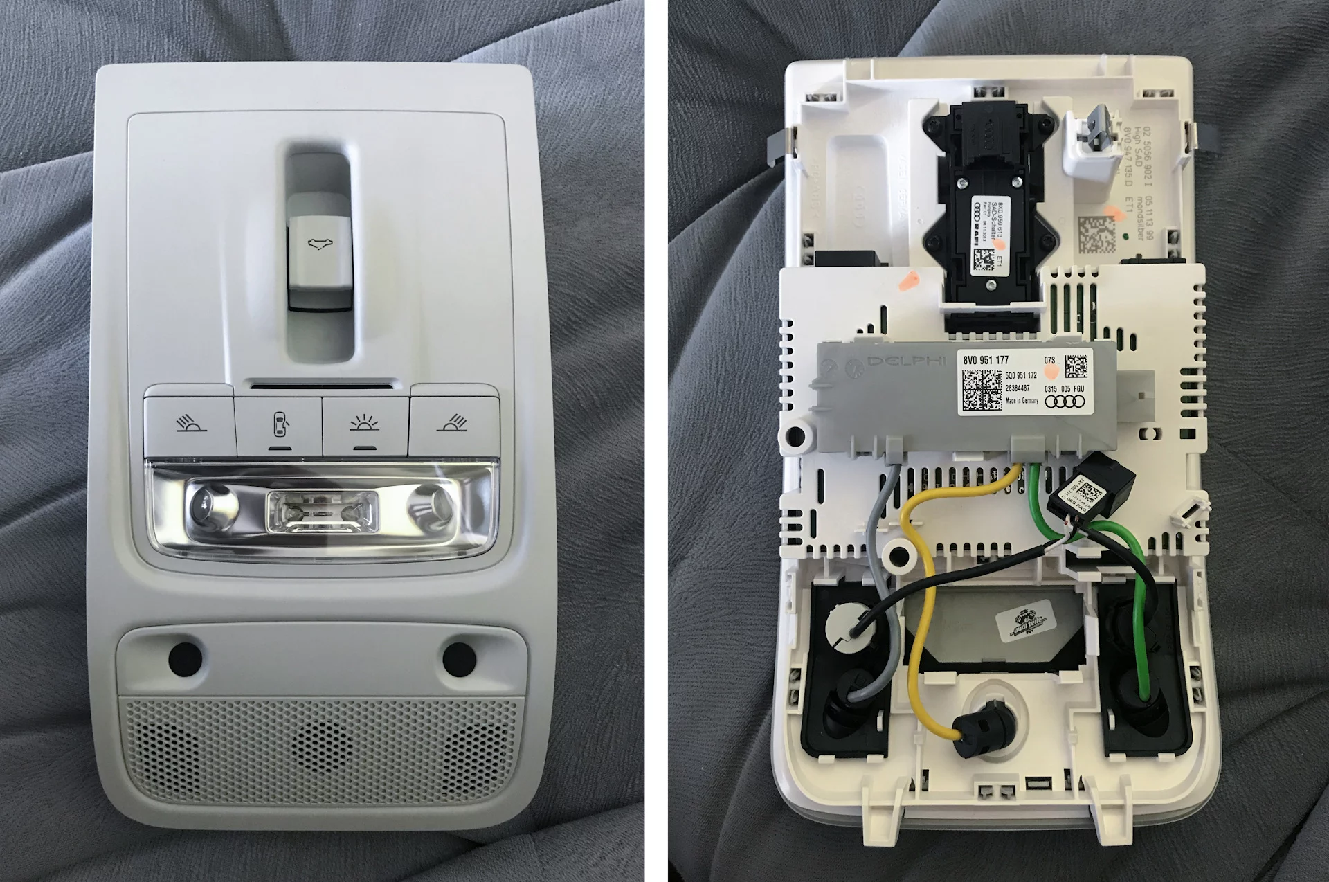 Поверх плафона прищелкнут модуль с ультразвуковыми датчиками движения 8V0 951 177. Для сборки штатной сигнализации теперь нужна подкапотная сирена (полно на разборках) и кнопка отключения системы в водительскую дверь. Можно попробовать подключить и только модуль движения, как-то наверно заработает. Покой нам только снится.
