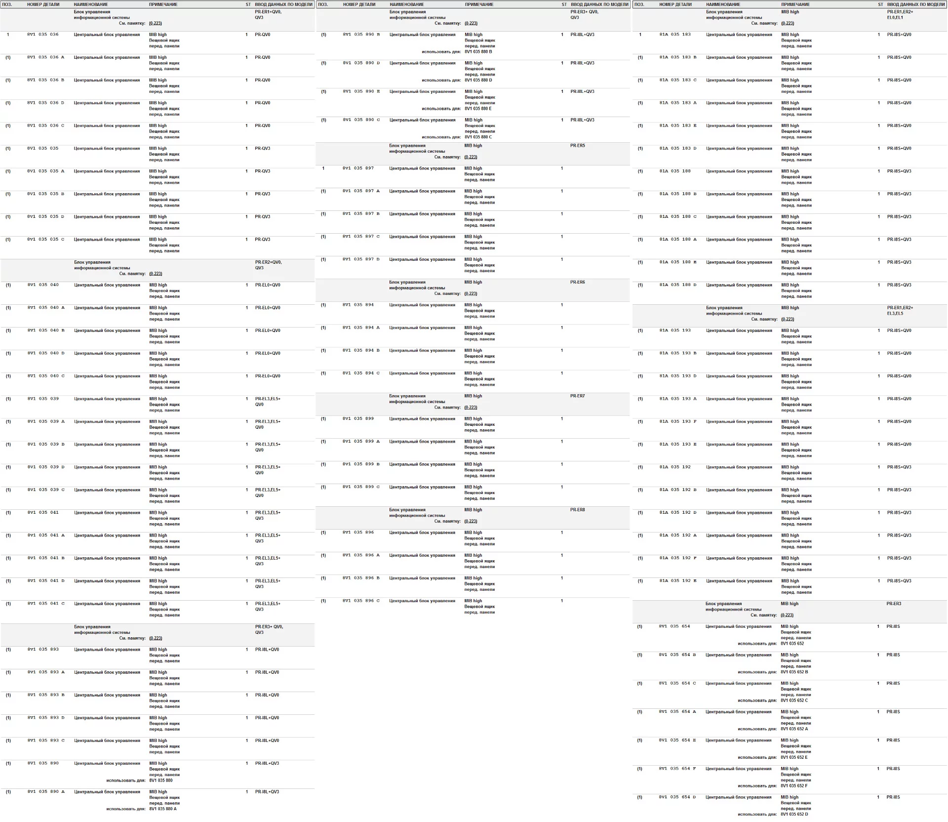 Посыпалось много вопросов о совместимости устройств. Скопировал весь список из ETKA (архив). В правой колонке есть коды опций машины, надо гуглить описания - по ним становятся понятны отличия каждого ГУ. Могут меняться региональные настройки AM/FM, DAB антенн, DVD проигрывателя, частоты GSM/LTE и такое прочее.