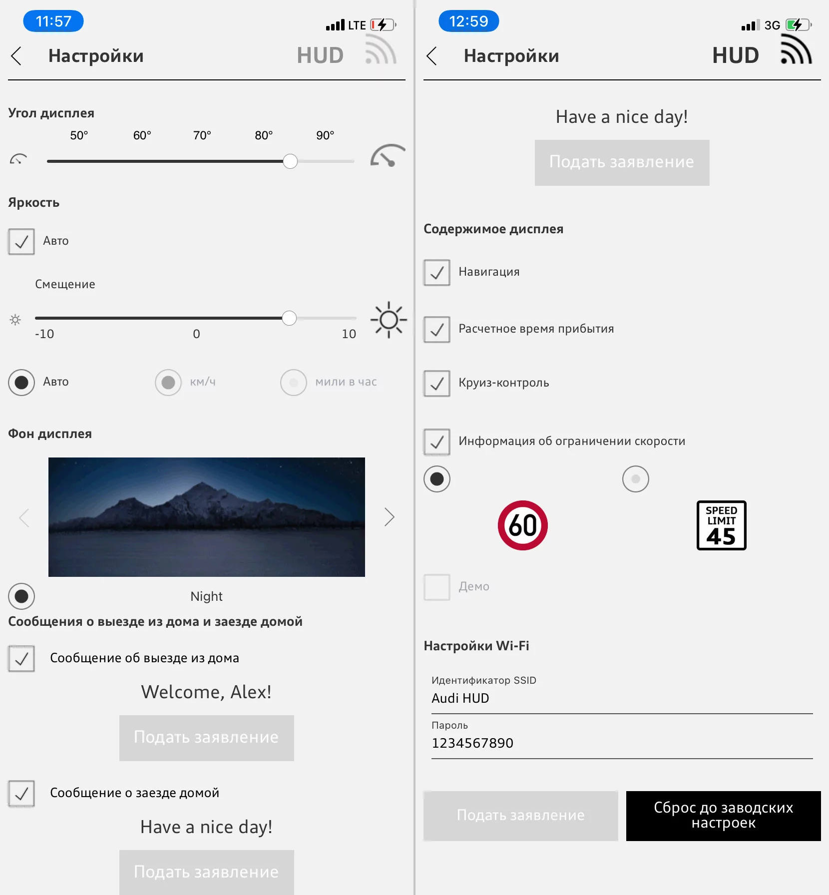 Для управления настройками экрана (заставка, приветствие, яркость, угол наклона) необходимо установить на телефон приложение Audi HUD и подключиться к нему по WiFi. Соединение часто отваливается, иногда не принимает пароль сети, помогает перезапуск кнопкой питания. Наклон можно регулировать дальше прямого угла, примерно до 100°. С таким запасом думаю можно найти удобную точку монтажа с любым комплектом ножек на любой торпеде.